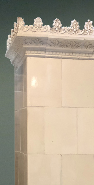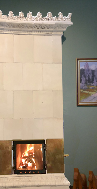 Der Kachelofen Källbacka ist anzuschauen wie ein wunderschönes Gemälde - bei genauer Betrachtung entdecken Sie ein umlaufendes Schmuckband, das an der obersten Spitze in einzigartigem stilisiertem Blattschmuck endet. Der untere Bereich erinnert an Burgzinnen, die dem Ofen somit einen Hauch von männlichem Charakter verleihen. Källbacka erstrahlt in gedecktem Weiß, was aufgrund der Lichtverhältnisse ein wenig täuschen könnte.