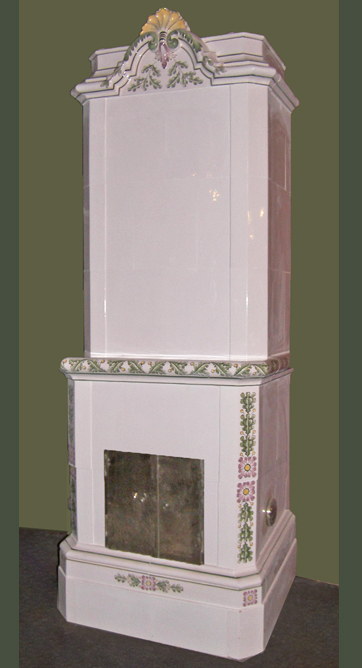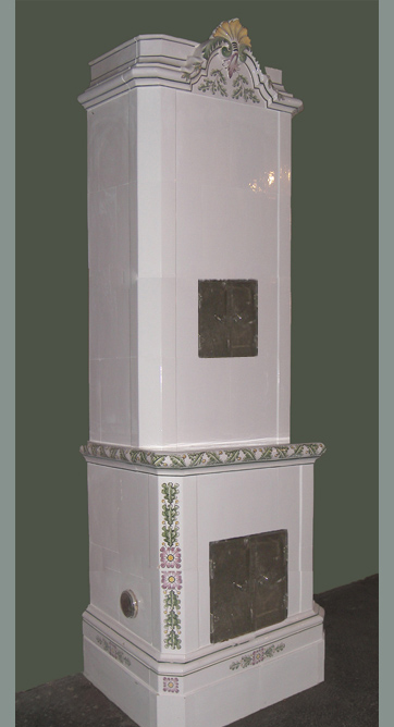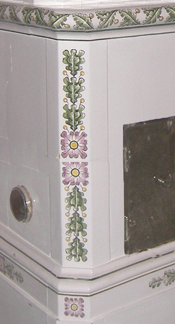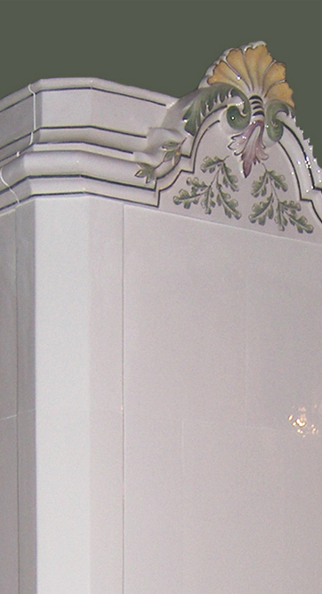 Während beim Sockel die Kanten sowie das Mittelband mit wertvollen Handmalereien geschmückt sind, wirkt der Oberteil durch die weißen, glänzenden Kacheln ruhig.