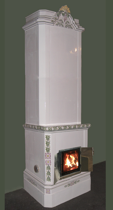 Dieser herrschaftliche Salonofen fällt durch seine schmale, schlank emporstrebende Silhouette auf.