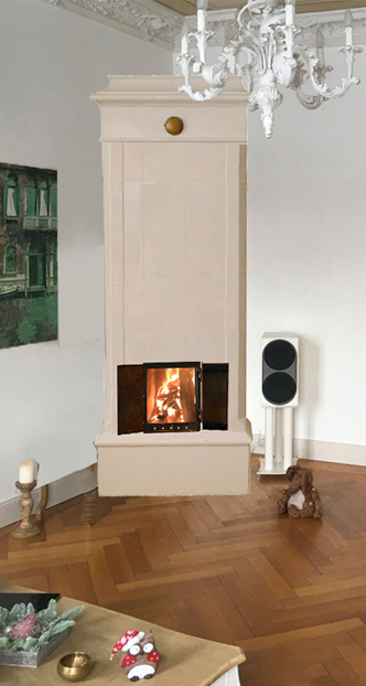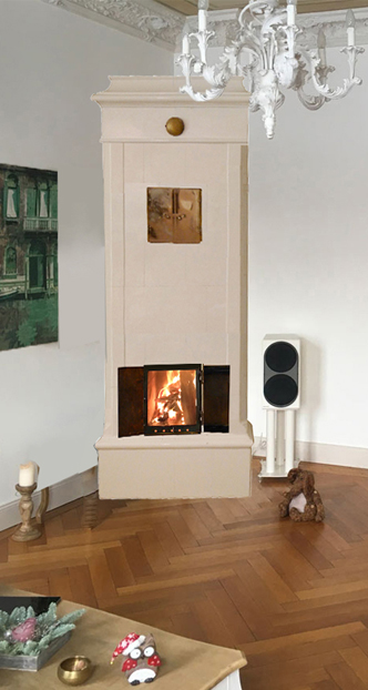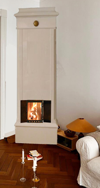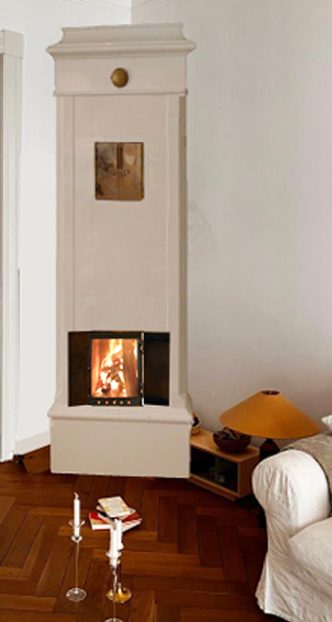 Linalund fällt durch klassische Strenge ins Auge. Die Front dieses Kachelofens ist zu den Seiten hin durch zurückhaltende Lisenen geziert, insgesamt wirkt dieses Stück ruhig und klar.