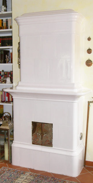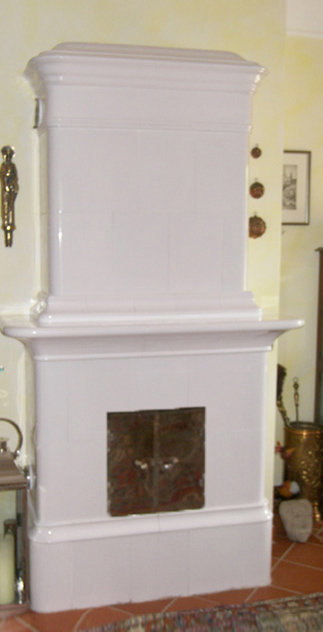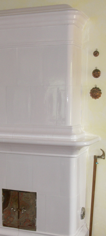Der Kachelofen verfügt über eine nach vorn vorspringende Ablage mit außergewöhnlicher Tiefe. Der Ofen bietet sich besonders in einem Ambiente mit geringerer Raumhöhe an.