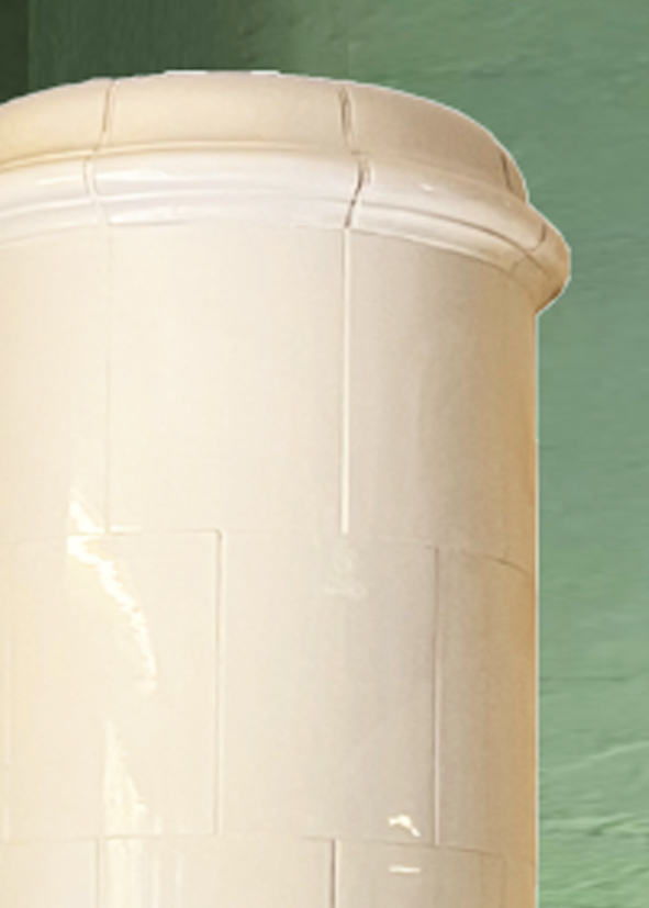 Die Krone dieses weißen Kachelofens hat einen schlichten, nach innen geneigten Abschluss.