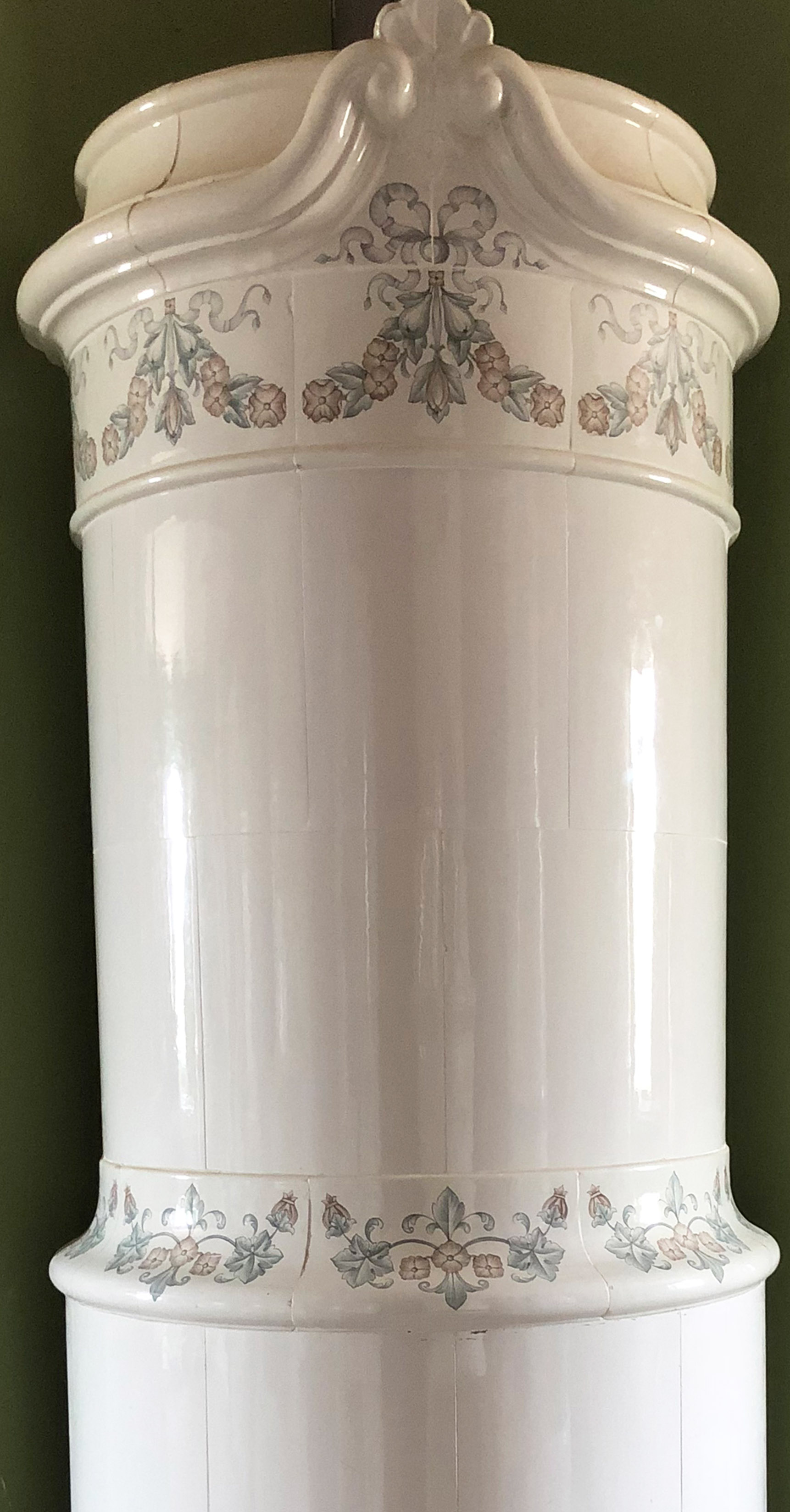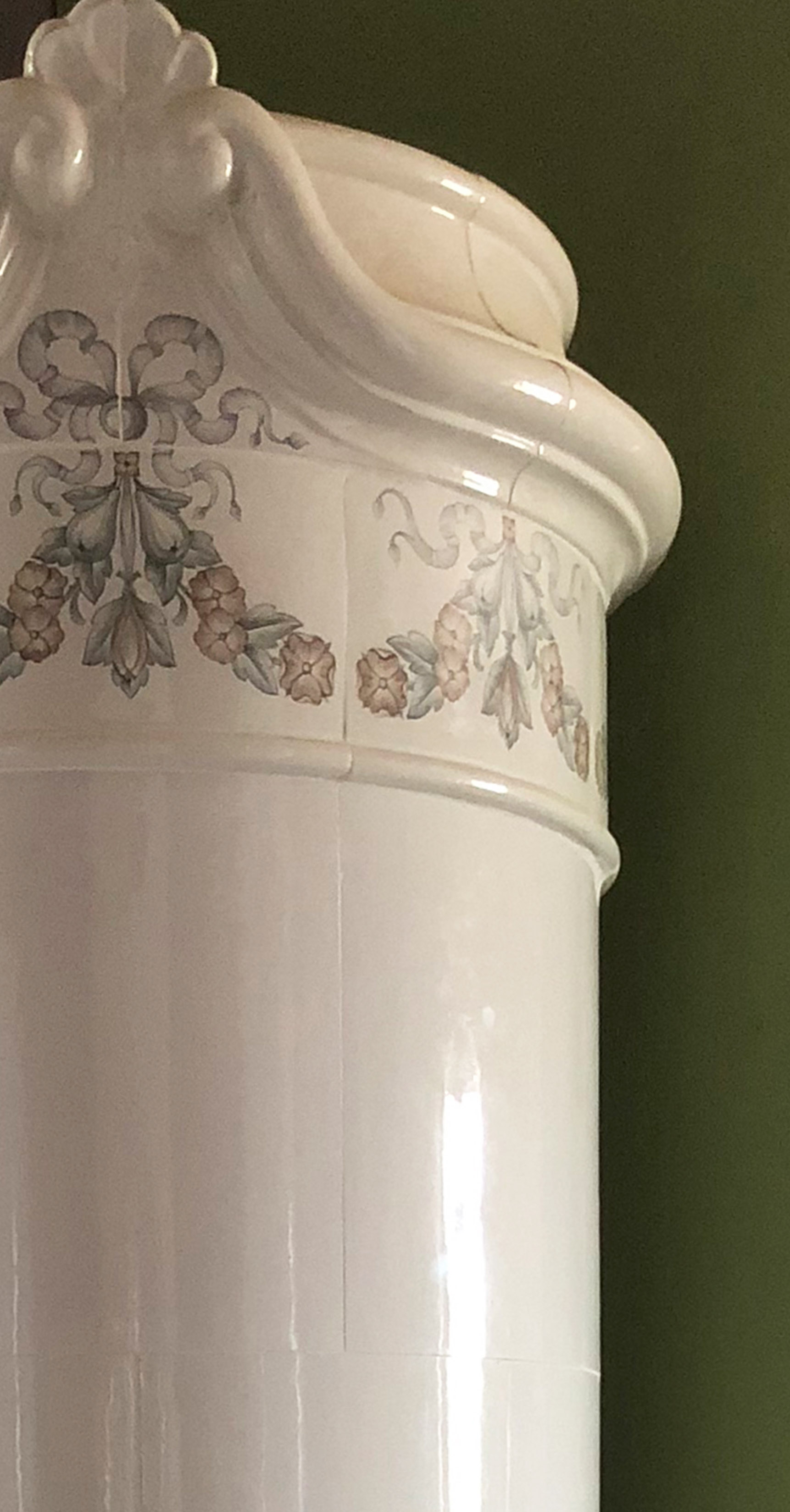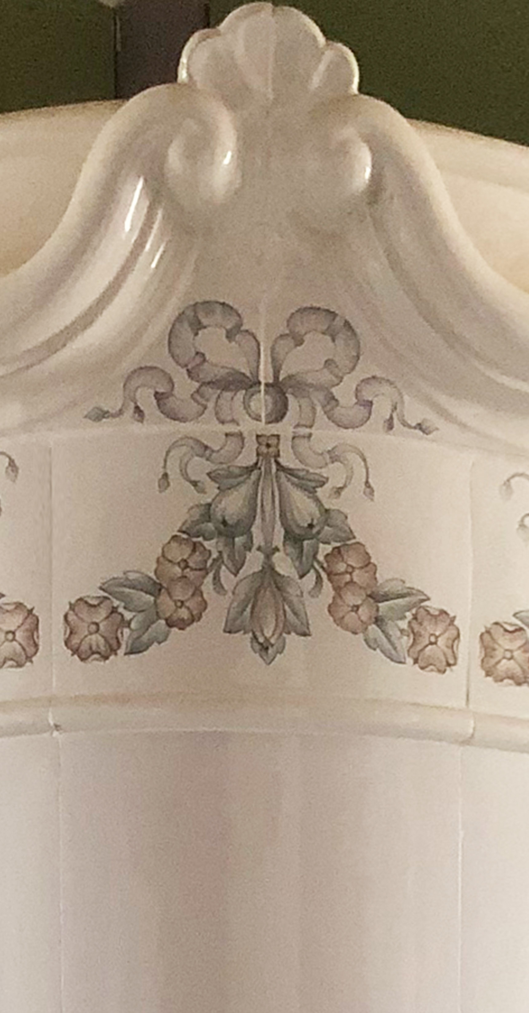 Solvik trägt seinen Schmuck am Mittelband und im Kronenbereich: Auf weißem Grund sind hier Blumenranken und Blättergirlanden von Hand aufgemalt. Besonders fällt die stilisierte Muschelkrone ins Auge.
