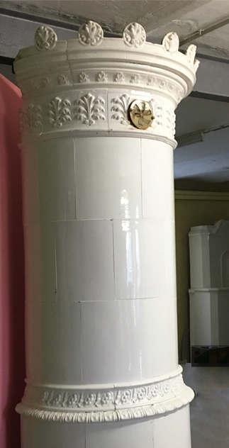 Der Kachelofen hat glatte, weiße Kacheln, zeichnet sich durch feine Ornamentierungen in den Simsen aus.