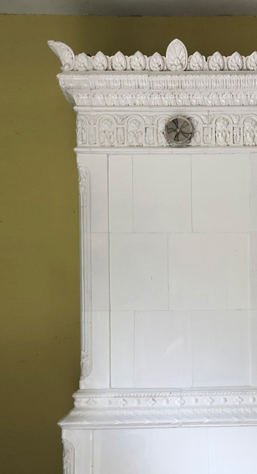 Der Ofen hat einen Mittelsims und strahlt in hellem Weiß.