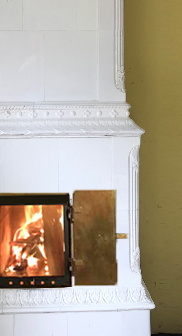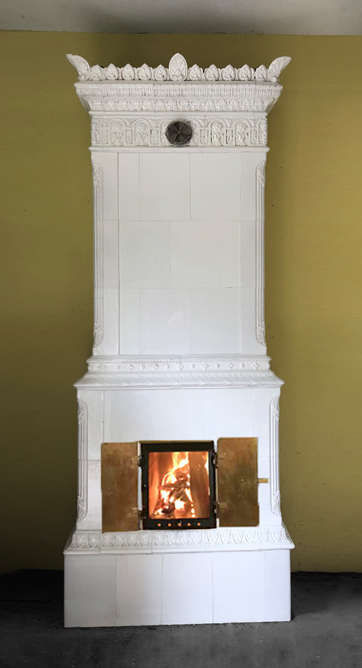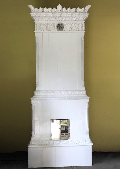 Vännäs ist ein rechteckiger Kachelofen mit detailliert ausgearbeitetem Schmuck: ornamentierte Simse geben die horizontale Gliederung vor, die Lisenen weisen zarte Verzierungen auf. Die äußeren Kronenspitzen scheinen interessiert in den Raum zu schauen.