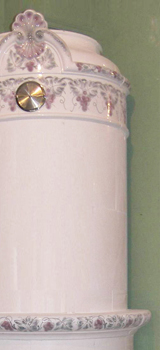 Bei diesem Kachelofen schmücken Handmalereien unter der Glasur den Sockelabschluss, das Mittelband und vor allem den Bereich der Krone. Die Malerei in rotvioletten Tönen zeigt Weinranken und stilisierte Reben. Die Krone ziert bei Vingarden mittig ein Muschelmotiv. Bitte beachten Sie: für die Platzierung in einer Eckposition wären Wandstücke von jeweils 50 cm ausreichend.